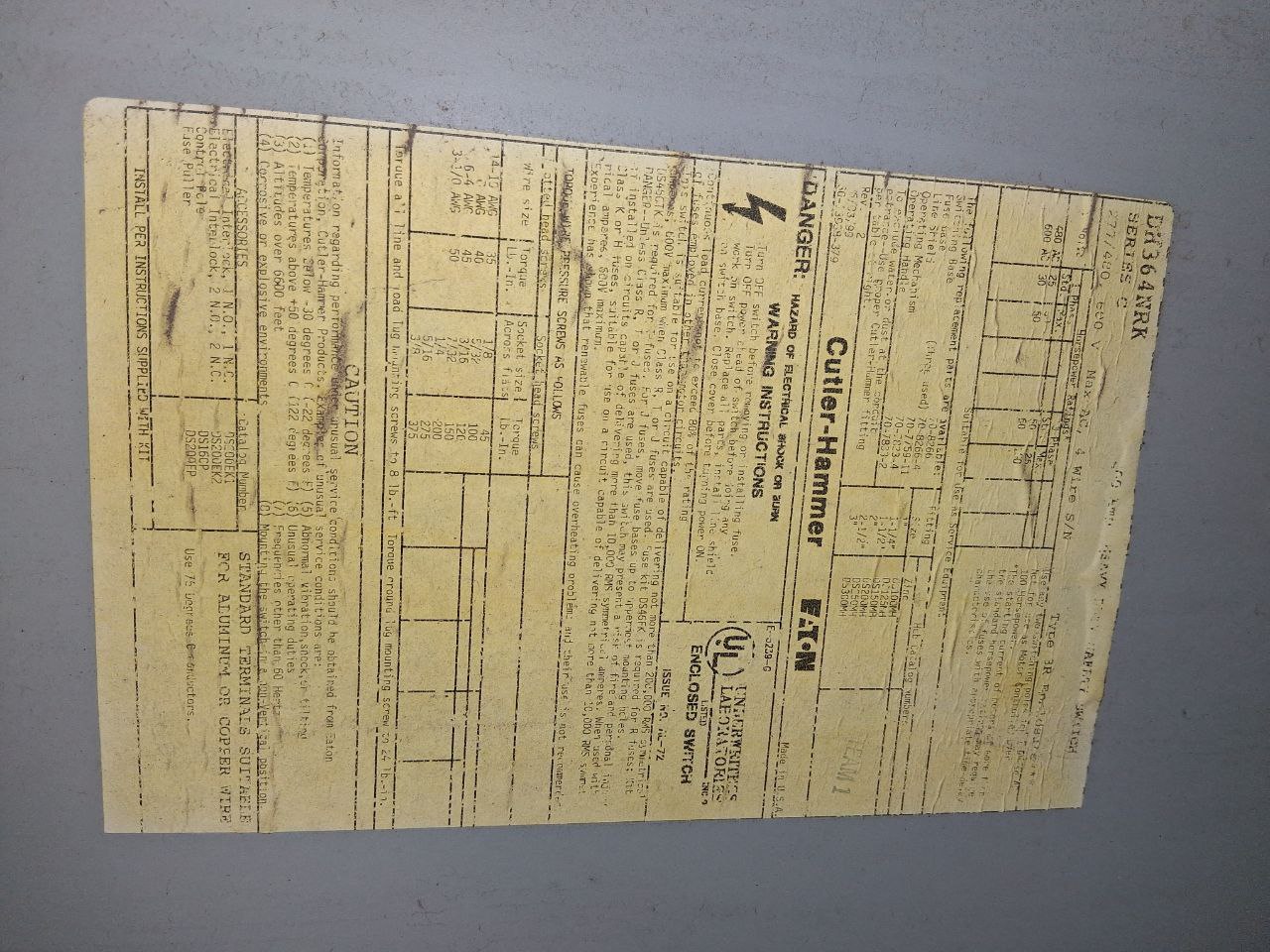 Cutler -Hammer Disconnect 200 Amp 600 Volt Cat# DH364NRK Fused