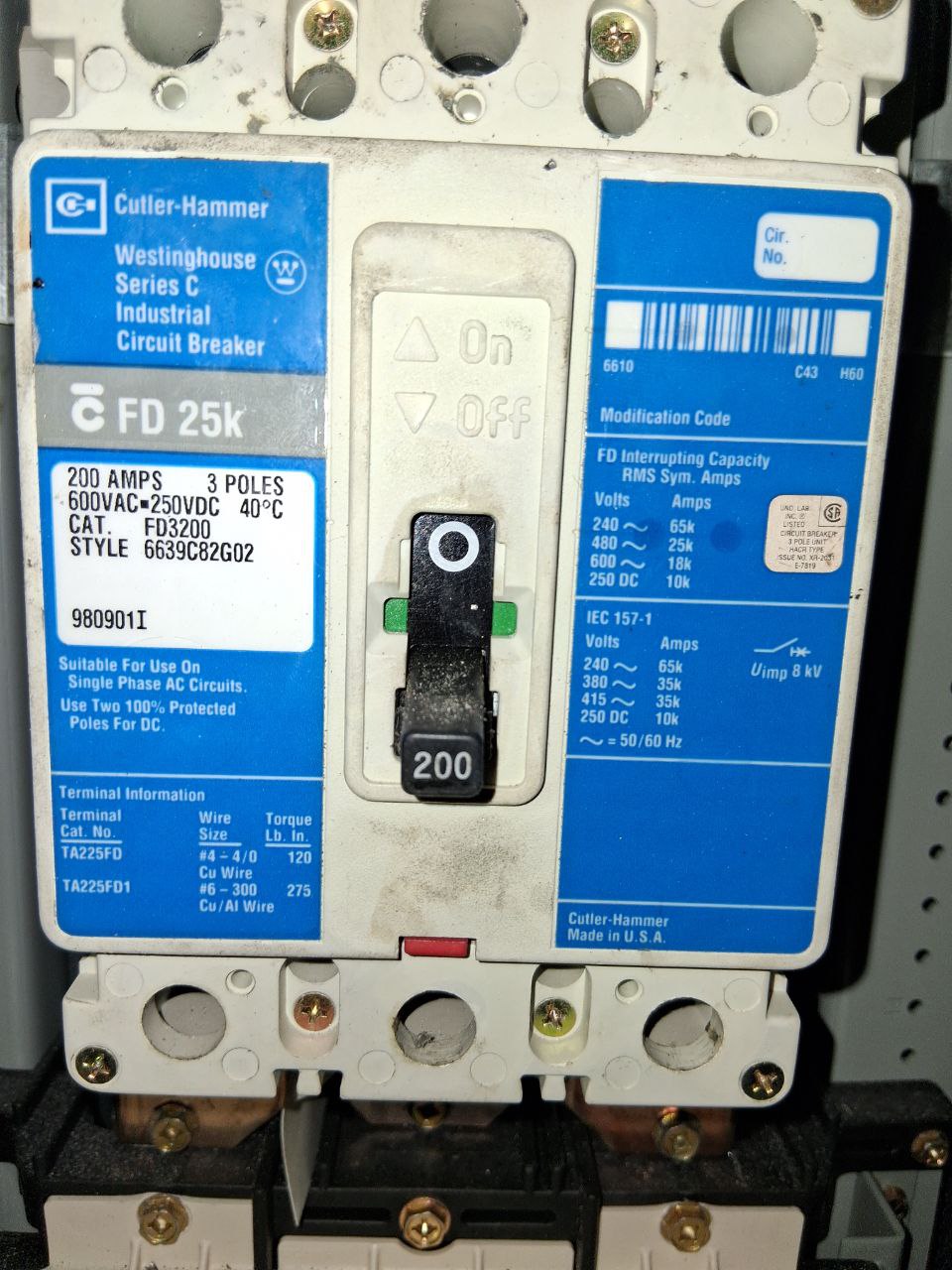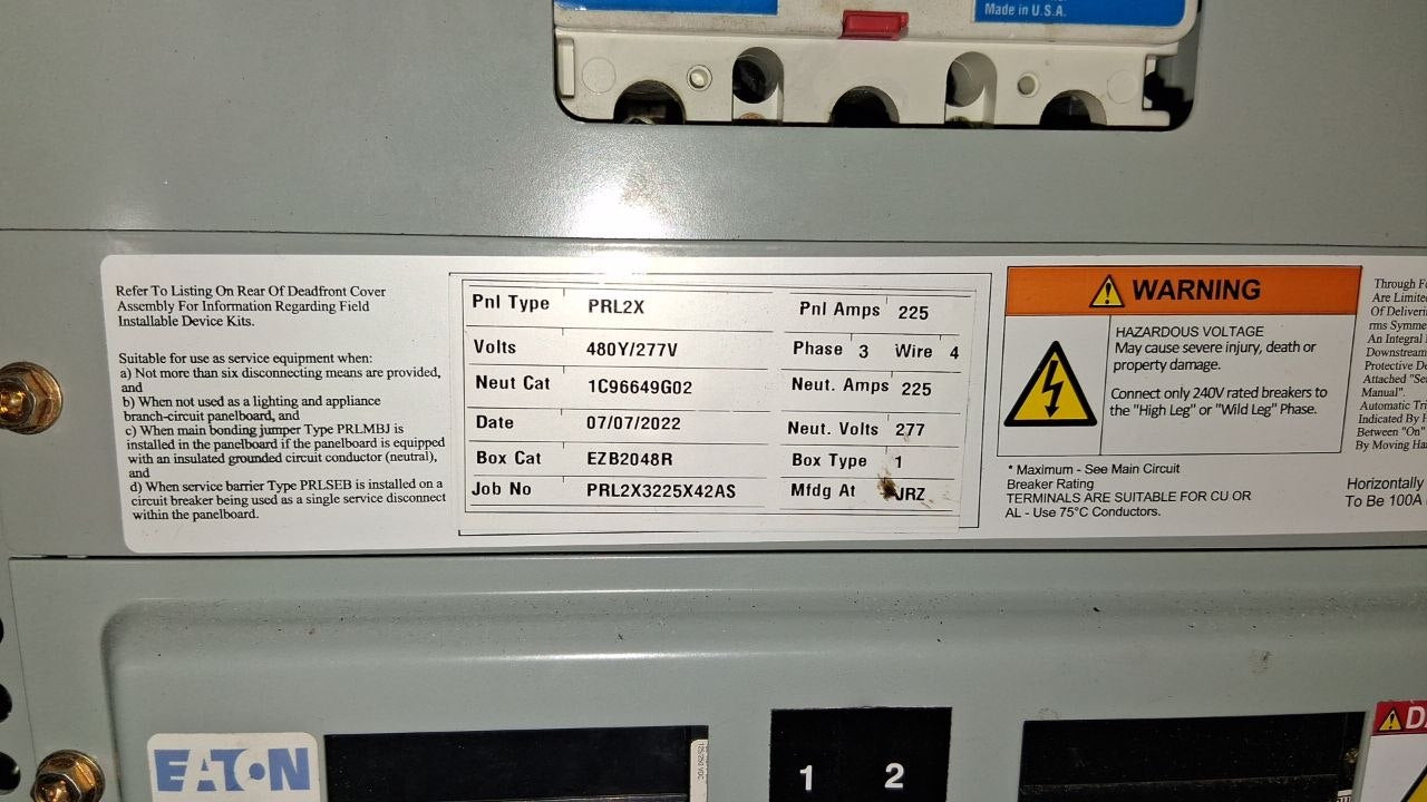EATON PRL2X 225 Amp Panel With a 200 Amp Main & Breakers 480Y/277 Volt 3 Ph 4 W