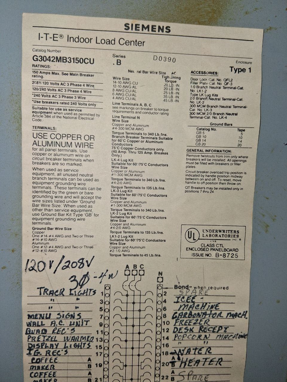Siemens/I-T-E 150 Amp Panel With Breakers 208Y/120 Volt 3 Phase 4 Wire
