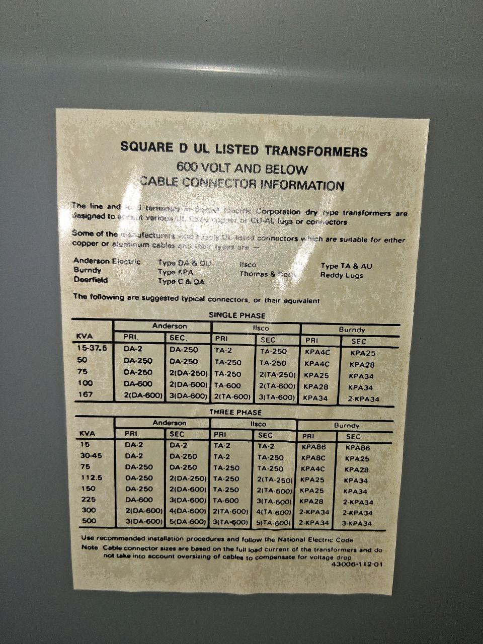 Square D 112.5 KVA Transformer 480 Volt 60 Hz Cat# 112T3H