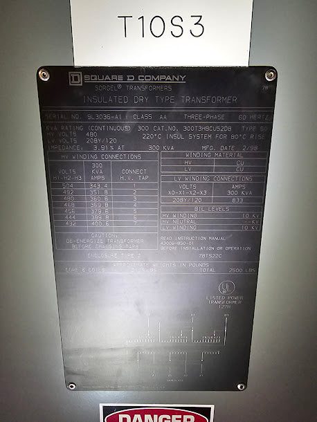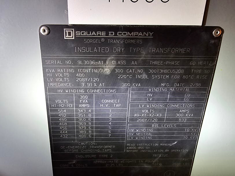 Square D 300 KVA Insulated Dry Type Transformer 480 Volt 3 Phase 60 Hz