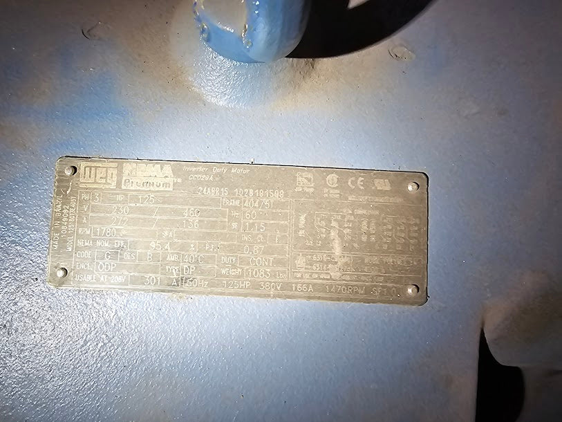 125 HP WEG Motor 230/460 Volt 272/136 Amp RPM 1780 3 Phase Frame 404/5T 60 Hz