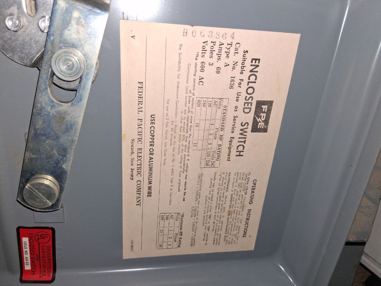 FPE Disconnect 60 Amp 3 Pole 600 Volt Cat# 1636