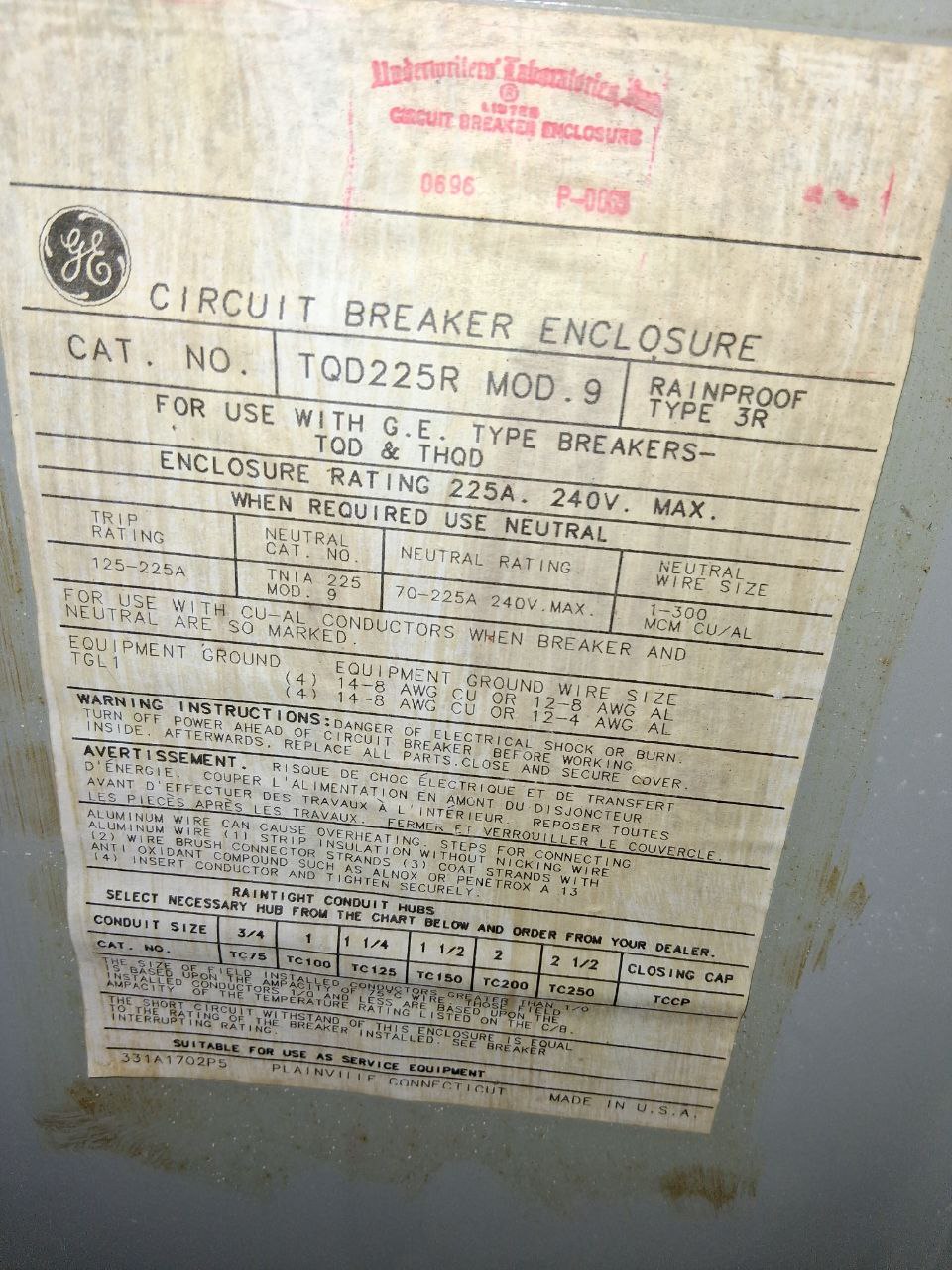 GE Circuit Breaker 150 Amp 240 Volt 3 Poles Model 9 Cat# TQD32150