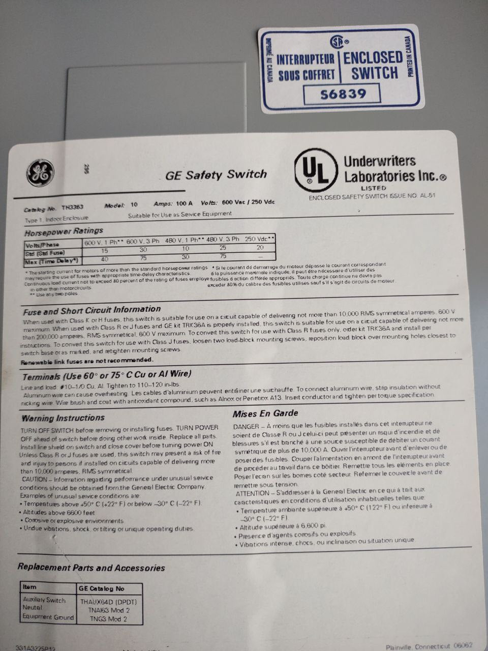 GE Disconnect 100 Amp 600 Volt Model 10 Cat# TH3363