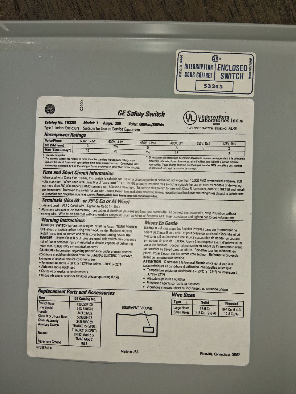 GE Disconnect 30 Amp 600 Volt Model 7 Cat# TH3361