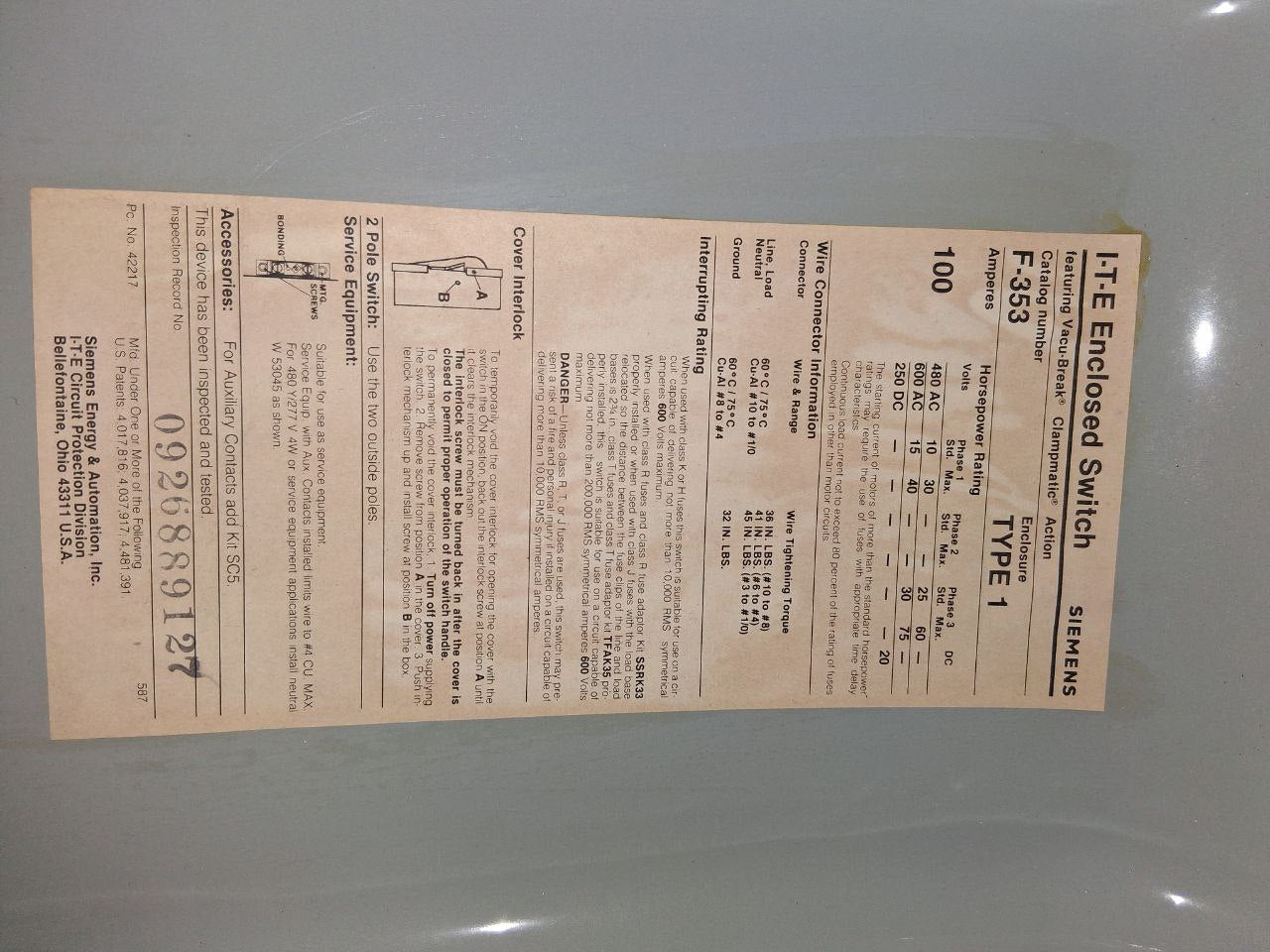 I-T-E/Siemens Disconnect 100 Amp 480 Volt Cat# F-353