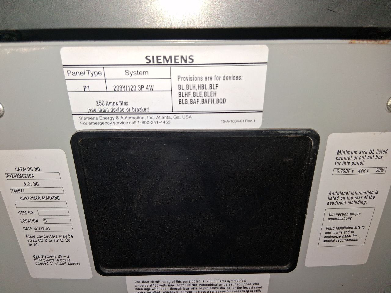 Siemens P1 250 Amp Panel With Breakers 208Y/120 Volt 3 Phase 4 Wire