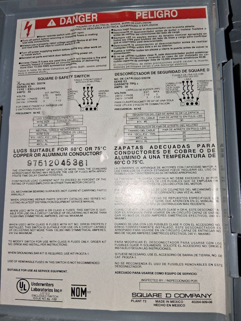 Square D Disconnect 30 Amp 240 Volt Cat# D321N
