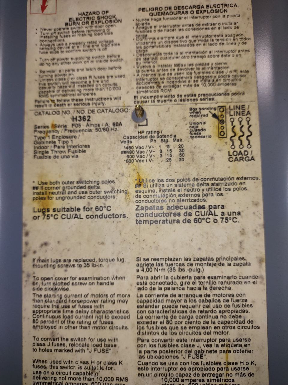 Square D Disconnect 60 Amp 600 Volt Cat# H362