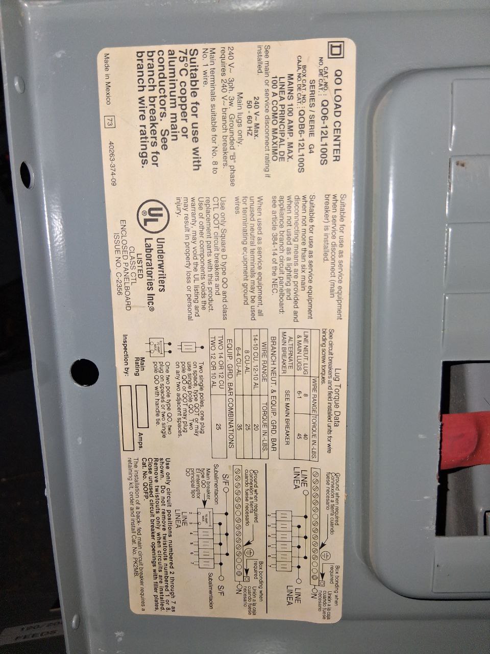 Square D QO Load Center 100 Amp 240 Volt 50/60 Hz Cat# QO6-12L100S